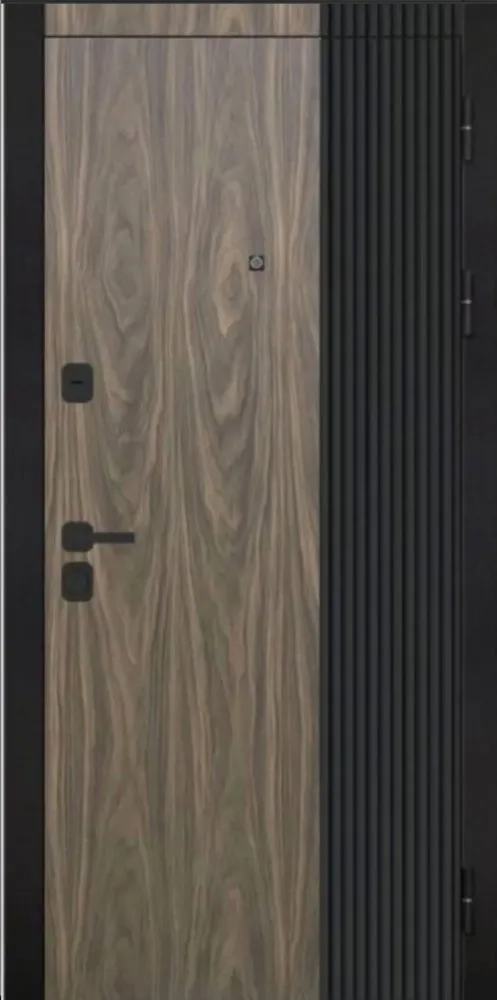 Металл: Порошково-полимерное покрытие, цвет Муар черный Отделка снаружи: лист стали, двухцветная ламинированная МДФ панель 12мм, цвет Орех Американский мокко + Антрацит софт